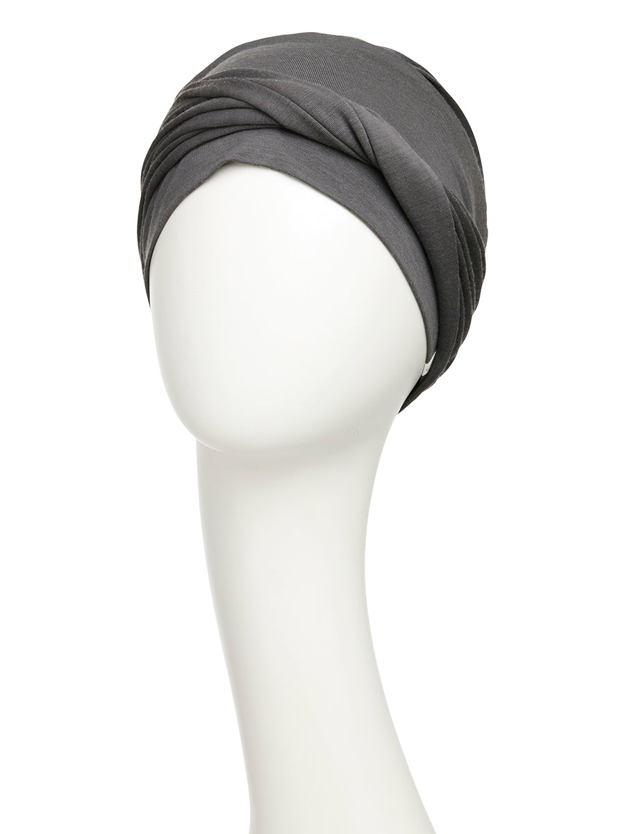 Copricapo con fascia twisted fissata posteriormente. Colore grigio scuro.